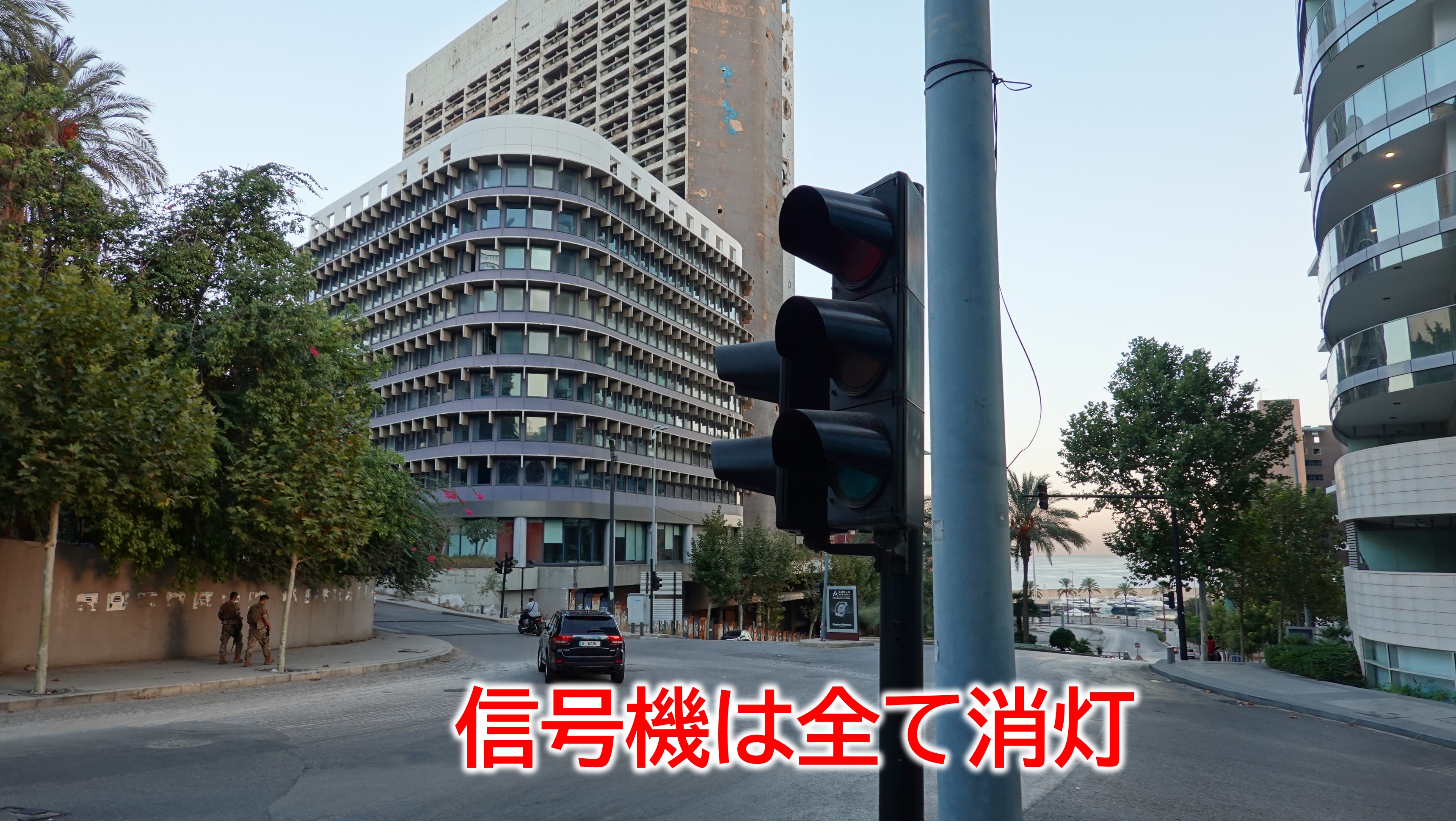 そして、後ろに写っているビル(廃墟っぽい)にはハチの巣状に穴が開いていたりする。20年前の戦争の弾痕跡とかなのか、それとも3年前の港の爆発によるものか理由は判らんけど。